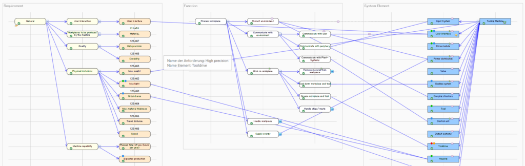 In der unten stehenden Grafik haben wir versucht, das so entstehende Systemmodell zu veranschaulichen. Insbesondere die Querbeziehungen bilden später die Grundlage für aussagekräftige Auswertungen: